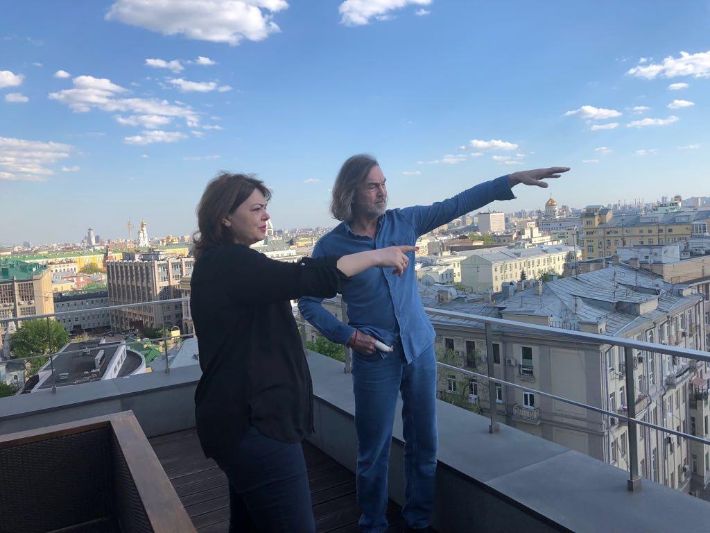 - Kremli tanıyırsan, Azərbaycan böyük elçiliyini də. Bura da Ukrayna böyük elçiliyidir. Yeri gəlmişkən, mən Ukraynanın vurğunuyam. Aşağıdakı Müslüm Maqomayevin heykəlidir. Sağa bax – Moskvanın ən gözəl tikililərindən biri - Ukrayna-Radisson Hotelinin binasıdır. Uzaqda səmanı dələn də Moskva Dövlət Universitetinin binasıdır. Mərkəz olsa da, həyət çox sakitdir. İşləmək üçün əla yerdir. Həm mənzərə var, həm sakitlik. Bu, Moskvanın qədim kilsələrindədir. Burada dayanıb həm də ibadət edirəm.