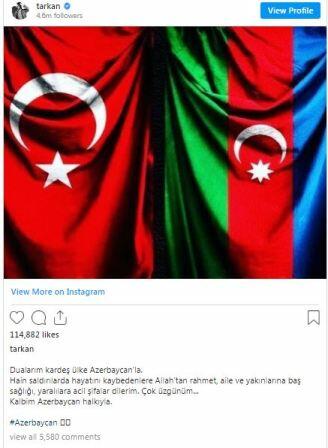 Tanınmış türkiyəli müğənni Tarkan Ermənistan ordusunun Gəncəyə son hücumunu kəskin qınayıb.