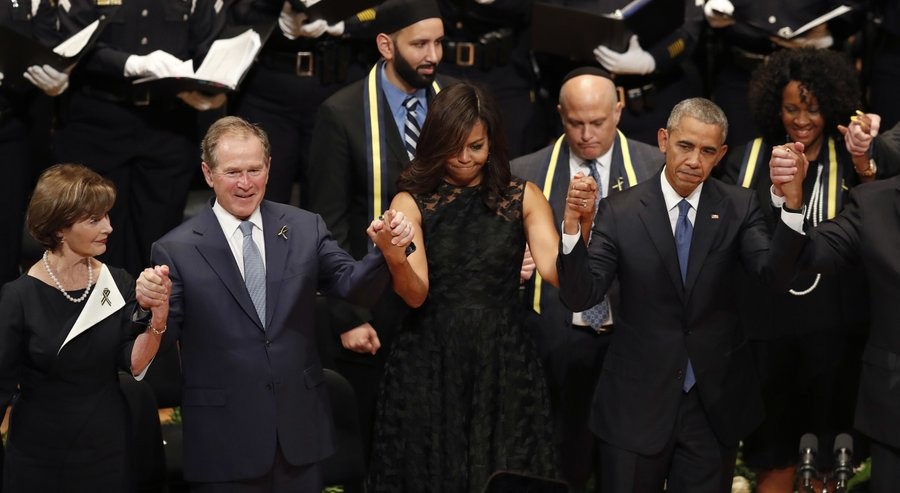 ABŞ-ın Dallas şəhərində öldürülən 5 polis əməkdaşı ilə bağlı təşkil edilən anım tədbirində keçmiş prezident Corc Buş gülərək rəqs edib.
