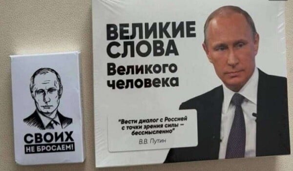 Dmitriyevin dərc etdiyi fotoşəkildə iki paket göstərilir: birində “Özümüzünküləri tərk etmirik”, digərində “Böyük insanın böyük sözləri” və “Rusiya ilə güc dili ilə danışmaq mənasızdır” ifadəsi.