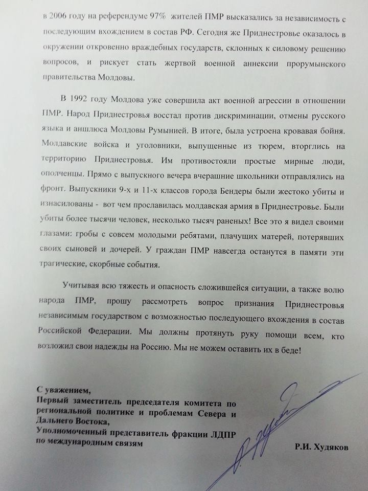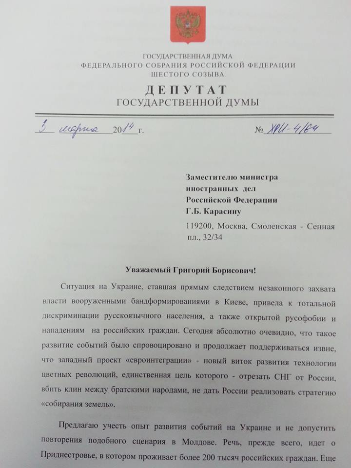 O, Dövlət Duması və Xarici İşlər Nazirliyindən bu rejimin müstəqilliyinin tanınmasını istəyib. Müraciətində Ukraynanı misal göstərən deputat Rusiyanın Dnesteryanını qorumalı olduğunu deyib. Daha sonra o, Rusiyanın ondan kömək istəyən hər kəsə yardım əli uzatmalı olduğunu söyləyib.