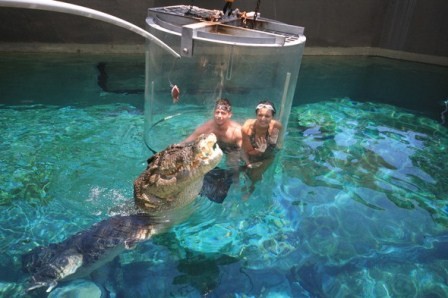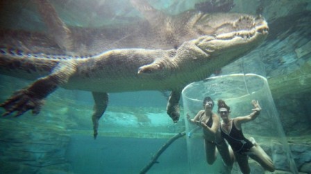 Axar.az xəbər verir ki, macəra həvəskarları suyun altında "Ölüm qəfəsi" adlandırılan və 5 metr uzunluğundakı şəffaf boruların içinə girərək timsahı yaxından izləyə bilirlər.