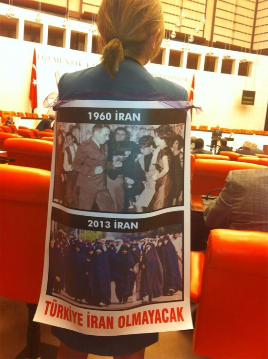 Türkiyədə CHP millət vəkili Dilək Akagün Yılmaz kürəyində "1960 İran" yazısı, altında başı açıq qadınların şəkilləri, "2013 İran" yazısı və altında çarşablı qadınların şəkilləri olan plakat asaraq Milli Məclis binasının ümumi salonunda etiraz edib.