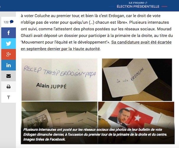 “Le Fiqaro” qəzetində dərc olunan “Nə üçün 2 avro xərcləyib etibarsız səs verirlər?” başlıqlı məqalədə qeyd olunur ki, Fransanın bəzi bölgələrində seçicilər tərəfindən seçki qutusuna atılan bülletenlər etibarsız sayılıb. Buna səbəb həmin bölgələrdə seçki bülletenlərinin üzərində Türkiyə Prezidenti Rəcəb Tayyib Ərdoğana dəstək şüarlarının yazılması olub. Həmin məntəqələrdə seçicilər seçki bülleteninin üzərinə Ərdoğanın adını yazaraq, ona səs verdiklərini qeyd ediblər.