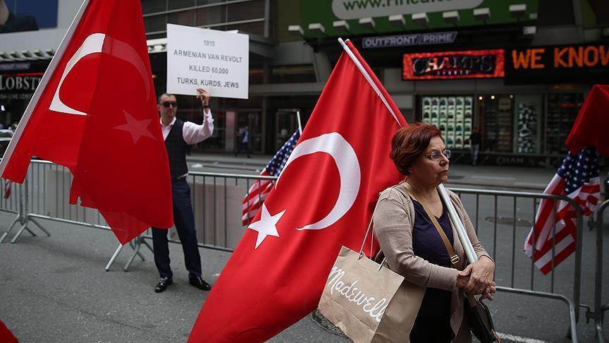 Tayms-skver rayonunda keçirilən aksiyada etirazçılar qondarma erməni soyqırımının əleyhinə şüarlar səsləndiriblər. Bundan başqa, türklər aksiyada ermənilər tərəfindən qətlə yetirilən türk diplomatların şəkillərini və Türkiyə ilə ABŞ-ın bayraqlarını qaldırıblar.