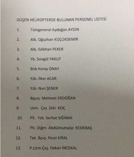 Türkiyə Silahlı Qüvvələr qəzada həlak olan hərbçilərin siyahısını ictimaiyyətə açıqlayıb.