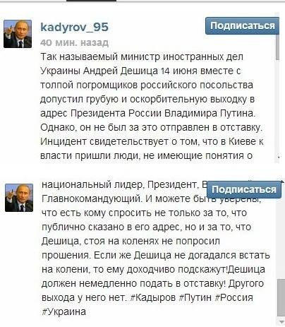 Çeçenistan Respublikasının rəhbəri Ramzan Kadırov Ukrayna Xarici İşlər naziri Andrey Deşiçanın Rusiya dövlət başçısı Vladimir Putinin ünvanına işlənən nalayiq mahnını oxuduğuna görə əməllicə əsəbləşib.