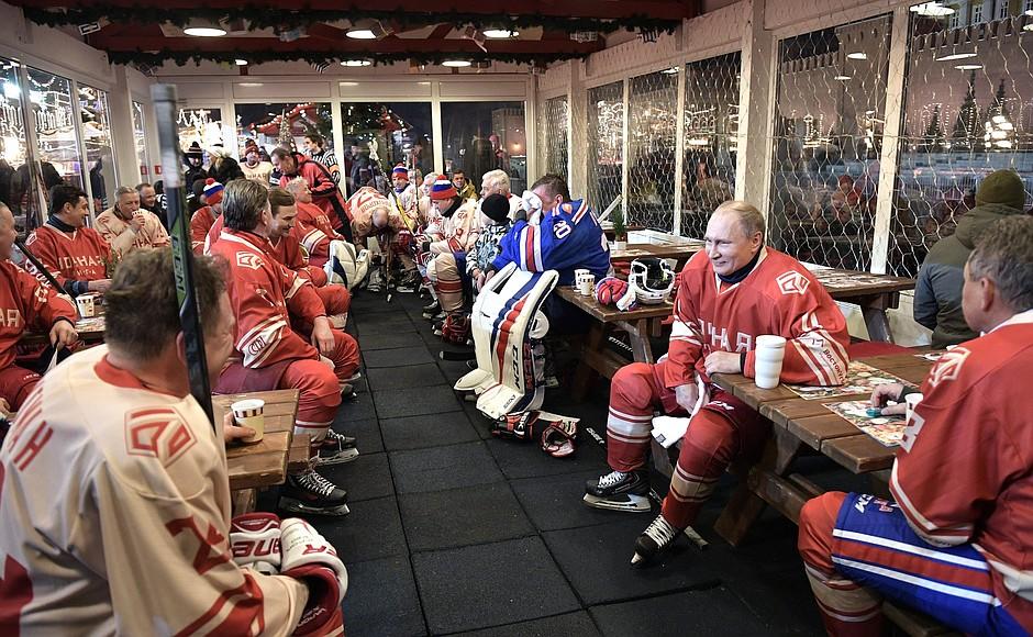 Putinlə bərabər görüşdə SSRİ yığmasının keçmiş oyunçuları Vyaçeslav Fetisov, Sergey Fyodorov, Pavel Bure, Müdafiə naziri Sergey Şoyqu və Kontinental Xokkey Liqasının direktoru Gennadi Timçenko da iştirak edib.