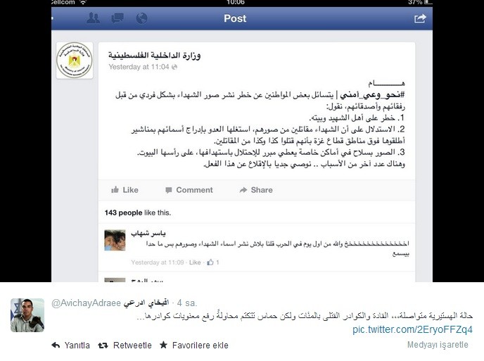Adrae verdiyi məlumatda HƏMAS-ı məhv edəcəklərini bildirib: "İsrail ordusu terror hücumlarının məqsədə çatmasına maneə törədəcək və HƏMAS-a bağlı bütün terror ünsürlərini və onlara aid alt qrupları vuracaq. Sakit bir həyat istəyən qəzzalıların tələblərini və ehtiyaclarını görməməzlikdən gələn, yer altında gizlənən HƏMAS liderlərinin təqibinə davam edəcəyik".