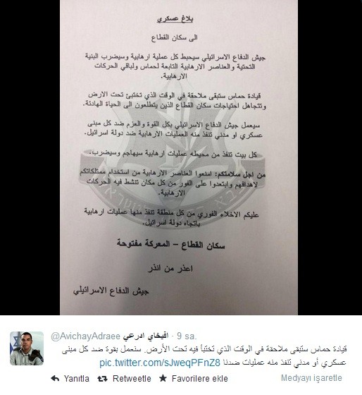 İsrail ordusunun sözçüsü Aviçay Adrae Qəzzaya yönəli hücumlarda bütün vətəndaşların və hərbi binaların hədəfə alınacağını bildirib.