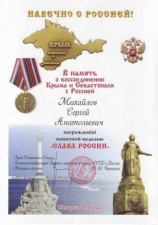 Qeyd edək ki, Mixaylovun aldığı medallar sırasında onun Krımın Rusiyaya birləşdirilməsində göstərdiyi xidmətə görə aldığı "Yaşasın Rusiya" döş nişanı da var.