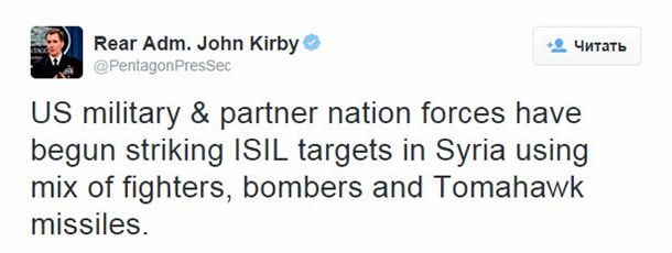 "ABŞ və koalisiya qüvvələri İŞİD-ə qarşı qırıcılar, bombardmançılar və "Tomaqavk" raketlərindən istifadə edirlər", - Kirbi özünün Tvitter hesabında yazıb.