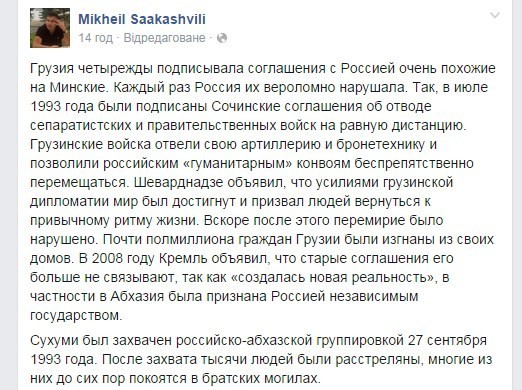 Axar.az xəbər verir ki, bu açıqlama ilə Gürcüstanın eks-prezidenti Mixail Saakaşvili öz Feysbuk səhifəsində çıxış edib. O, hər dəfə bu danışıqların Rusiya tərəfindən pozulduğunu bildirib: