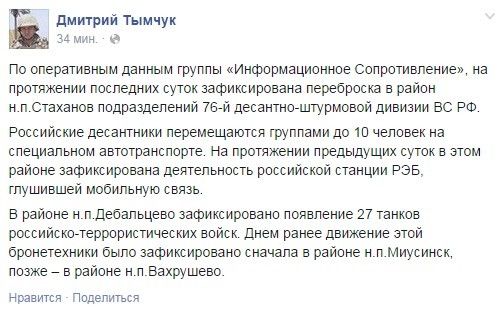 Axar.az xəbər verir ki, bu açıqlama ilə ukraynalı hərbi ekspert Dmitri Tımçuk öz Feysbuk səhifəsində çıxış edib. O, həmçinin Rusiyanın 27 tankının da Debalçova rayonu ərazisinə gətirildiyini bildirib.