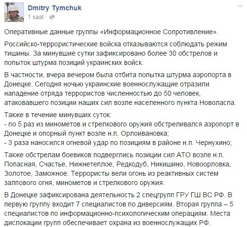 Onun sözlərinə görə, Rusiyadan göndərilən silah-sursatların əksəriyyəti Donetsk aeroportu yaxınlığına yerləşdirilir: "Minaatan, artilleriya və reaktiv mərmilərin 50-60 faizi buraya göndərilir".