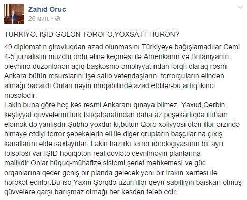 öz Feysbuk səhifəsində çıxış edib. O, türk kəşfiyyatını Qərb