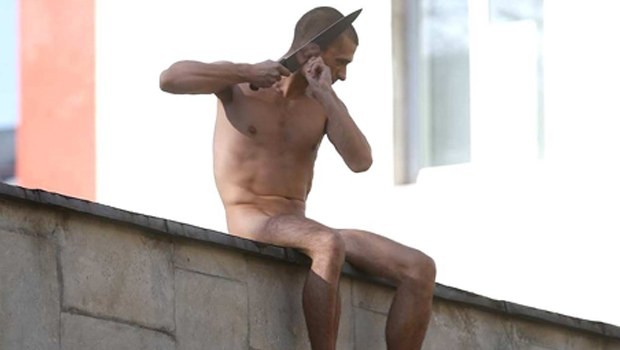 Lüt soyunaraq divara dırmaşan rəssam əlində böyük bir bıçaqla