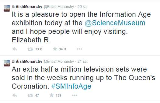 Dünən Elm muzeyini ziyarət edərək "Məlumat dövrü" qalereyasının açılışını edən kraliça ilk tvitində bu sözləri yazıb: "Bu gün Elm muzeyində "Məlumat dövrü" sərgisini açdığıma şad oldum. Ümid edirəm ki, insanlar da ziyarət etdikləri üçün şad olacaqlar. Yelizaveta R.".