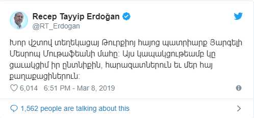 Türkiyə Prezidenti Rəcəb Tayyib Ərdoğan İstanbulun erməni patriarxı, arxiyepiskop Mesrop Mustafyanın ölümü ilə bağlı Tvitter mikrobloqunda başsağlığı mətni yayımlayıb.