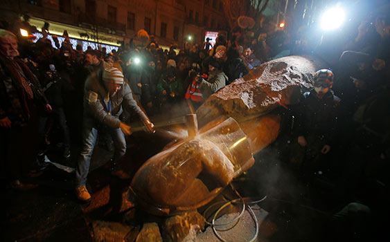 Heykəli uçurduqdan sonra nümayişçilər Ukraynanın dövlət himnini səsləndirib.