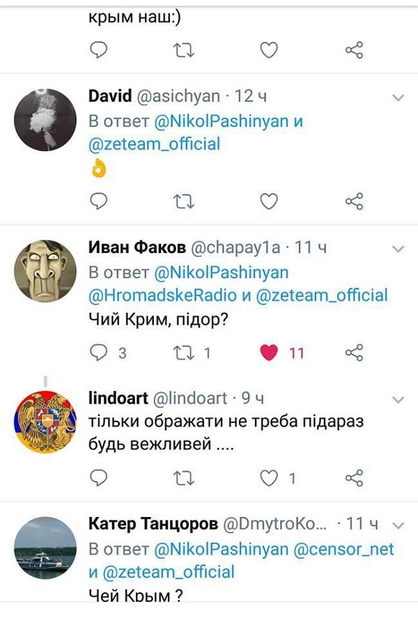 Ermənistanın Ukraynanın ərazi bütövlüyününə dair BMT qətnaməsinin səsverməsi zamanı Rusiyanı dəstəkləməsini xatırladan ukraynalı sosial şəbəkə istifadəçiləri “Krım kimindir?” sualını Paşinyana ünvanlayıblar. Onlar Ukraynanın ərazi bütövlüyünü tanımayan Paşinyanın Zelenskini təbrik etməsini ən sərt sözlərlə cavablandırıblar.