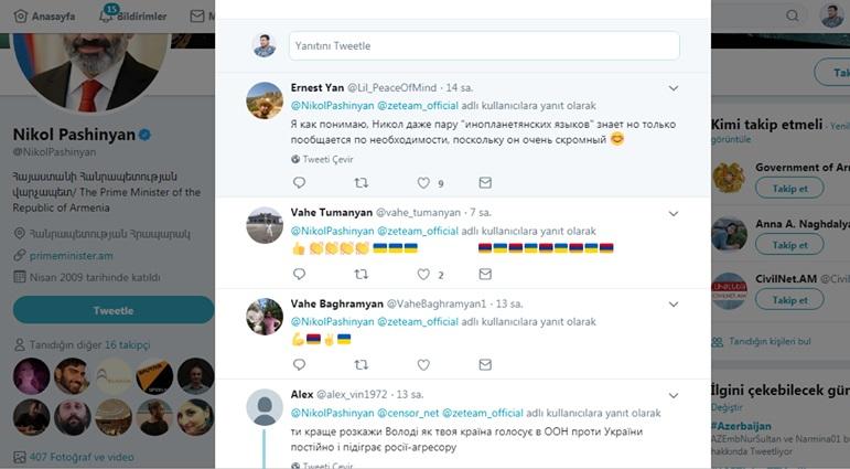 “Ukrainian people” adlı istifadəçi Paşinyana müraciətlə “Vladimirə də düzgün şəkildə Rusiyanın altına uzanmağı öyrət” yazıb. “Heinz Bar” adlı istifadəçi isə “Kloun klounu uzaqdan görür” sözləri ilə erməni liderə cavab verib.