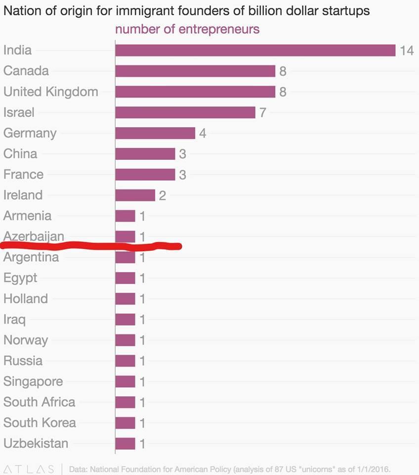 2Bu istiqamətdə araşdırma apararkən qarşıma 2016-cı ilin 1 yanvar tarixinə olan ATLAS: Amerika siyasəti üzrə milli fond tərəfindən dərc edilən maraqlı məlumat çıxdı. Həmin məlumatı diaqram formasında şəkil bölməsində təqdim edirəm. Diaqramdan göründüyü kimi, ABŞ-da 1 milyard dollardan çox dəyərə malik olan startup (inkişafa meyilli yeni ideyalar və təşəbbüslər üzərində qurulan başlanğıc biznes layihəsi) qeydiyyatdan keçirən imiqrantların mənşə ölkələri arasında Azərbaycan da vardır. Bu o deməkdir ki, hazırda bu ölkədə 1 milyard dollardan çox bazar dəyəri olan ən azı 1 azərbaycanlı miqrant yaşayır. Kimliyini müəyyənləşdirmə bilməsəm də, ölkəmizin adını bu siyahıda görməkdən məmnun qaldım”.