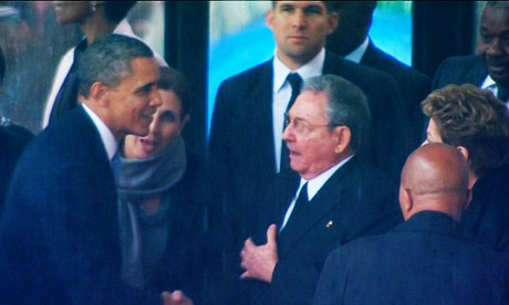 Mərasimin ən diqqət cəlb edən anlarından biri ABŞ prezident Obamanın təxminən əlli ildir düşmən ölkə Kuba lideri Fidel Kastronun qardaşı, Raul Kastro ilə əl sıxışması olub.