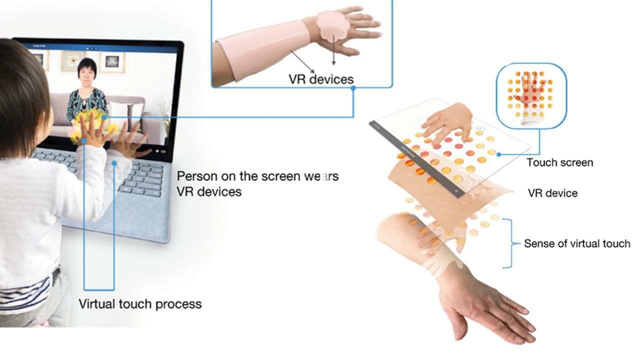 Virtual toxunuş yumşaq və elastik bir təchizata qoşulmuş, sürətli proqramlaşdırıla bilən miniatür titrəməli disk sayəsində reallaşır. Bu sistem sayəsində ağıllı dəri, bədənə sensorlar vasitəsilə məlumat girişini təmin edir. Beləcə özümüzü qarşı tərəfə toxunmuş kimi hiss edirik.
