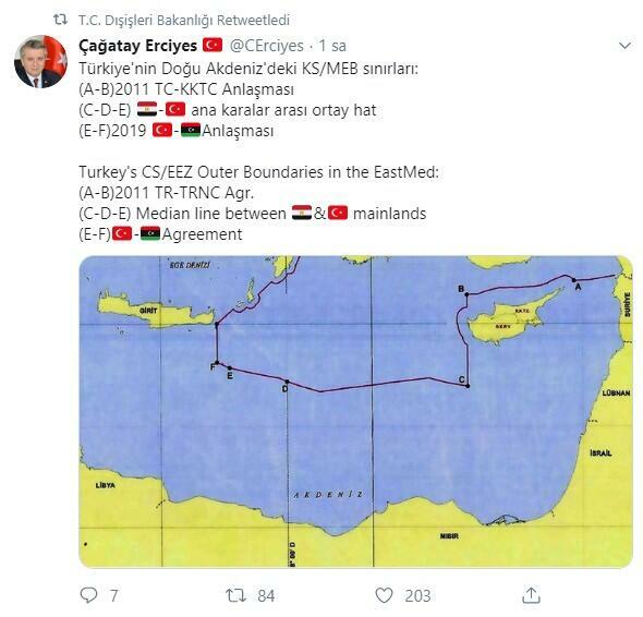 Axar.az Publika.az-a istinadla xəbər verir ki, Daxili İşlər Nazirliyi İkili Siyasi məsələlər və Dənizçilik Aviasiya Sərhəd baş direktorunun köməkçisi səfir Çağatay Eciyəs Şərqi Aralıq dənizindəki kontinental şelf və xüsusi iqtisadi zona (MEB) sərhədlərini göstərən xəritəni Tvitter hesabından paylaşıb.