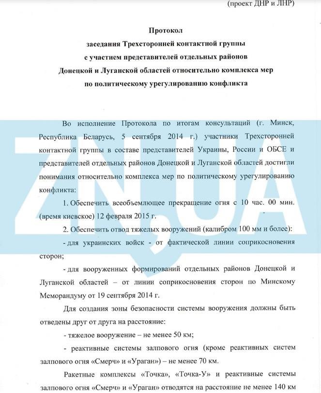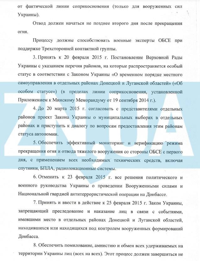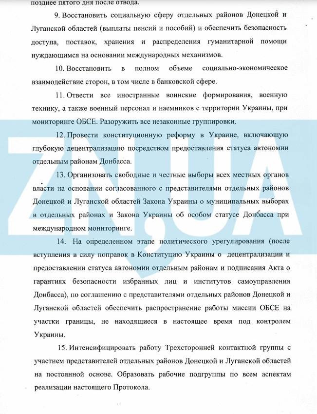 Sənəddə "Donetsk və Luqansk Xalq Respublikaları" Ukraynadan öz ordusunu geri çəkməyi tələb ediblər. Həmçinin Donetsk və Luqansk vilayətlərinə xüsusi statusun verilməsi də sənəddə yer alan tələblər sırasında olub.