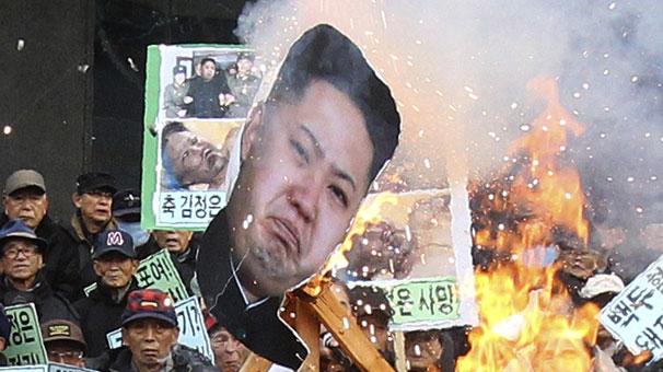 fotoşəkilləri və Koreya bayraqları yandırılır.