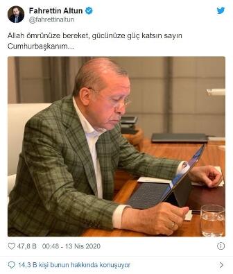 Axar.az xəbər verir ki, F.Altun Ərdoğanın kompüter arxasında çəkilən fotosunu paylaşaraq, “Allah ömrünüzə bərəkət, gücünüzə güc qatsın, cənab Prezidentim”, - şərhini yazıb.
