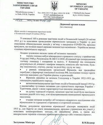 Axar.az Qaynarinfo-ya istinadən xəbər verir ki, Bodnar sözügedən məktubda Ukraynanın "erməni soyqırımı”nı (dırnaqlar saxlanılıb) tanımadığını bildirir və "Osmanlı İmperiyasında 24 aprel 1915-ci il faciəvi hadisələri” ifadəsindən istifadə edir.