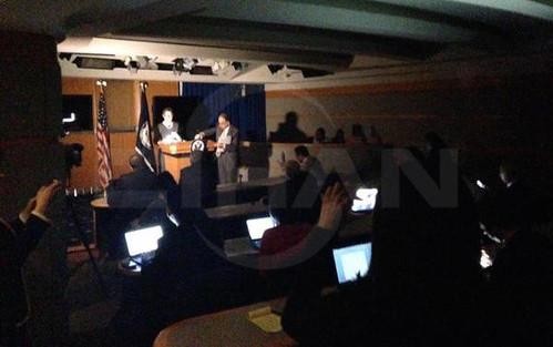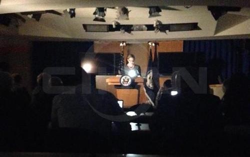 Elektrik cərəyanının kəsilməsi zamanı Dövlət Katibliyinin mətbuat xidmətinin rəhbəri Meri Hərf çıxışına mobil telefondan işıq tutaraq davam edib.