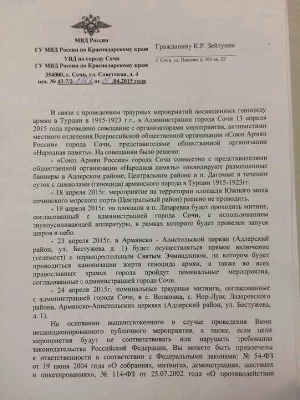 Axar.az xəbər verir ki, artıq bu barədə Rusiya Daxili İşlər Nazirliyinin Soçi şəhəri üzrə şöbəsinin rəhbəri Sergey Oqurçov artıq qadağa barədə bütün erməni icmasına məlumat verib. Bundan başqa, artıq şəhərdən "soyqırım"ın 100 illiyi şərəfinə asılmış bilboardlar da sökülüb.