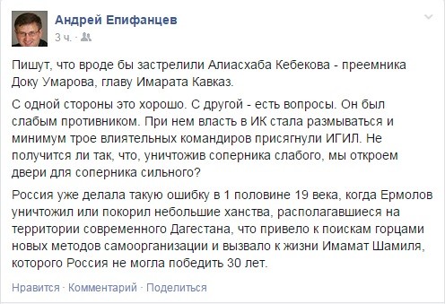 "İmarət Qafqazın lideri Əliasxab Kebekovun öldürülməsi bir tərəfdən yaxşıdır, amma başqa bir tərəfdən məsələyə yanaşdıqda ortaya problemlər çıxır. O, ən zəif rəqib idi. Onun hakimiyyəti dövründə "İmarət Qafqaz" parçalanmağa başladı və terror qrupunun üç ən mühüm komandiri İŞİD-in tərkibinə keçdiyini bəyan etdi. Biz zəif rəqibi öldürməklə güclü düşmənə yol açmış olmuruqmu? Rusiya bu cür səhvi 19-cu əsrin birinci yarısında etmişdi. O zaman Yermolov müasir Dağıstan ərazisindəki kiçik xanlıqları məhv edərək, Rusiyanın tərkibində birləşdirdi. Bu, dağlıları yeni təşkilatlanma metodları axtarmağa vadar etdi və həyata Şamil gəldi. Rusiya isə ona 30 il müddətində qalib gələ bilmədi".