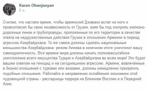 Axar.az xəbər verir ki, bu sözləri öz Feysbuk səhifəsində Qarabağ separatçılarının məşhur hüquq müdafiəçisi Karen Ohancanyan paylaşıb. O, bütün dünyadakı erməniləri Türkiyə və Azərbaycanın əmlakını məhv etmək üçün hərəkətə başlamağa çağırıb.