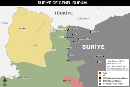 Xatırladaq ki, Türkiyə sərhədi yaxınlığında müxalif qruplarla İŞİD arasında qarşıdurmalar son günlərdə daha da şiddətlənib. Türkiyənin Kilis vilayətinin 8 kilometrliyində yerləşən Harcele kəndindən hücuma keçən müxaliflər 25 kilometrlik cəbhə boyu terrorçulara qarşı genişmiqyaslı əməliyyatlara start verib.