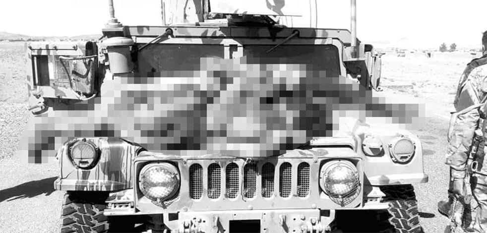 Əfqanıstan ordusunun hərbçiləri öldürülən Taliban üzvlərinin meyitlərini hərbi maşınların önünə sərir.