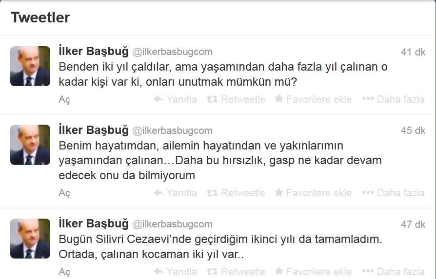 "Axar.az" xəbər verir ki, iki ildir Ergenekon işi ilə bağlı həbs olunaraq Silivri həbsxanasında yatan keçmiş Ali Baş Qərargah rəisi İlkər Başbuğ "tviter"dən açıqlama verib: