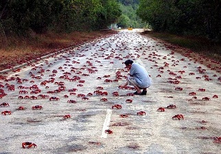 Milyonlarla qırmızı xərçəng nəsil artırmaq üçün dənizə doğru köç edir. İlin bütün vaxtını meşədə keçirən xərçənglər burdan çıxıb bütün ada boyu hərəkət edirlər.