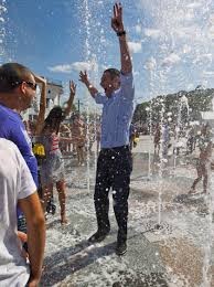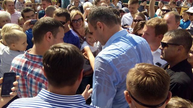 Təbrik çıxışından sonra Kliçko bir neçə sakinlə fontana girərək sərinlənib.