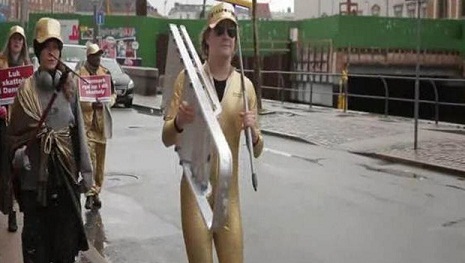 Danimarkada qızılı rəngdə iş paltarı geyinən bir qrup fəal məclis binasının şüşələrini silib.