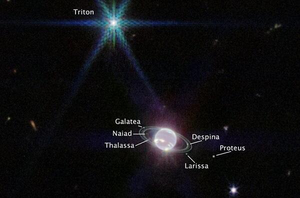 "Yuxarı sol küncdəki obyektə baxın. Bu, ulduz deyil. Bu, Neptunun böyük, qeyri-adi peyki Tritondur! Triton dondurulmuş qatılaşdırılmış azotla örtüldüyünə görə ona düşən Günəş işığının 70%-ni əks etdirir. Bu da onun “Ceyms Veb”də görüntüsünü çox parlaq edir”, - məlumatda qeyd olunub.