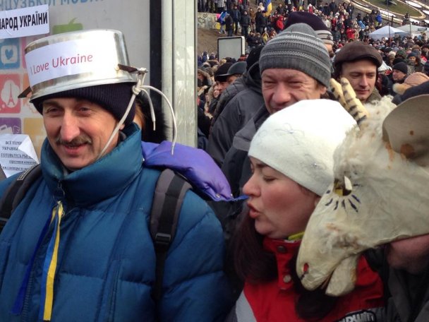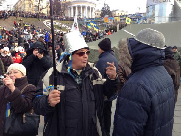 Ukraynada Avromaydan iştirakçıları başlarına vedrə, qazan və dəbilqə qoyaraq gəliblər.