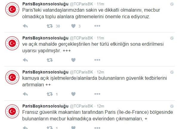 Türkiyənin Fransadakı səfirliyi baş verən terrordan dolayı Parisdə yaşayan türkləri diqqətli olmağa çağırıb.