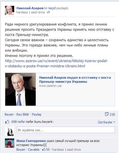 Qeyd edək ki, bu gün Nikolay Azarov Ukraynanın baş naziri postundan istefa verib. Hazırda mətbuat qanunvericiliyə uyğun olaraq Nazirlər Kabinetinin də yaxın zamanda buraxılacağını qeyd edir.