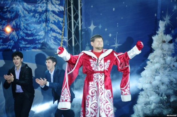 Şaxta baba paltarı geyinən Kadırov çıxışını "Allahu Əkbər" sədaları altında bitirib.