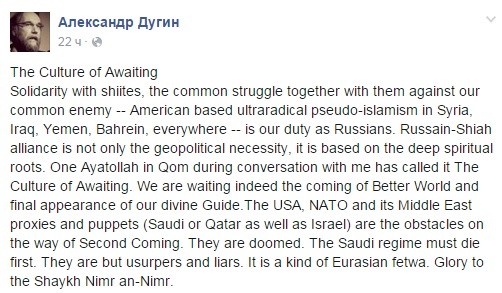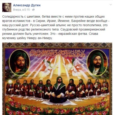 Axar.az xəbər verir ki, bunu öz Feysbuk səhifəsində Kremlə yaxınlığı ilə seçilən məşhur rusiyalı politoloq Aleksandr Duqin paylaşıb. Onun sözlərinə görə, rus-şiə alyansı təkcə geosiyasi xarakter daşımır: